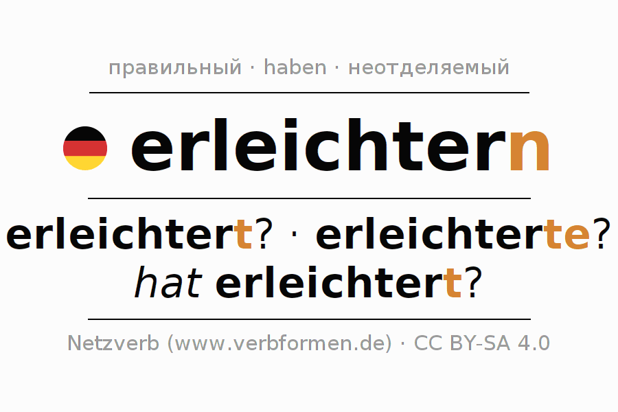 - Презенс: erleicht(e)r(e) (du), erleichtern wir, erleichtert (ihr), erleichtern Sie