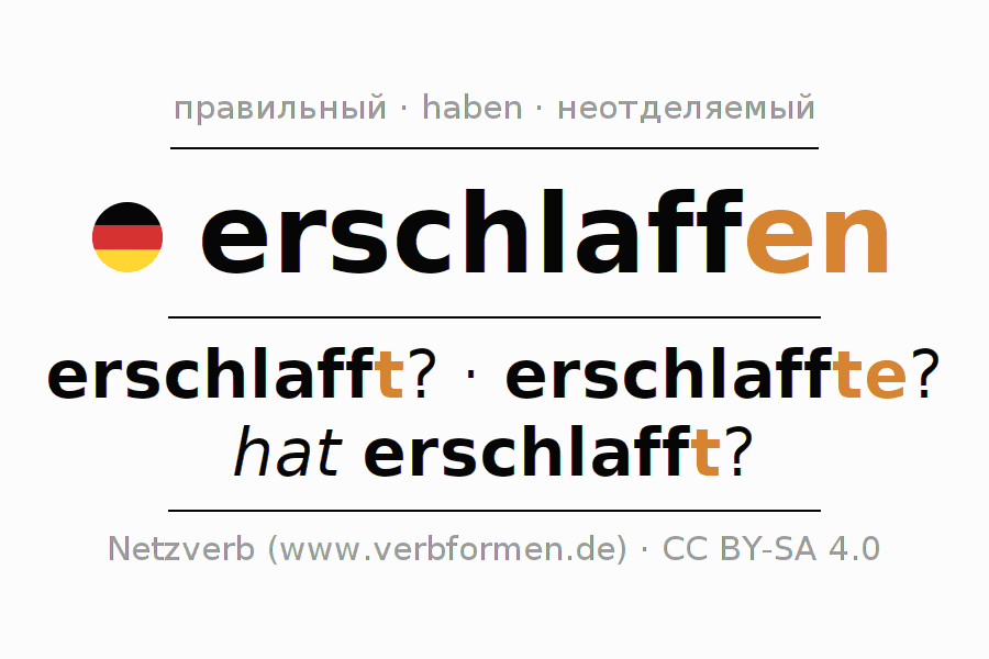 Спряжение глагола erschlaffen (ослабевать, ослабеть) правильное. Формы глагола erschlafft?, erschlaffte?, hat erschlafft?. В качестве вспомогательного глагола к erschlaffen употребляется "haben". Однако имеются временные формы со вспомогательным глаголом sein. Приставка er- для erschlaffen неотделяемая. Склоняется в Действительный залог (актив) и употребляется в Вопросительное предложение. Для лучшего понимания приводится большое количество примеров употребления глагола erschlaffen. Для тренировки и закрепления навыков имеются также бесплатные рабочие листы по erschlaffen. Можно не только erschlaffen спрягать, но и все немецкие глаголы. Глагол включён в словарный запас обладателя сертификата знания немецкого языка уровня C2. Kомментарии ☆