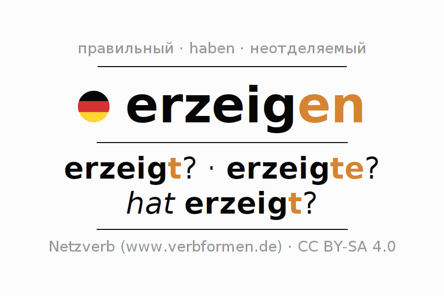 - Презенс: erzeig(e) ich?, erzeigst du?, erzeigt er?, erzeigen wir?, erzeigt ihr?, erzeigen sie?