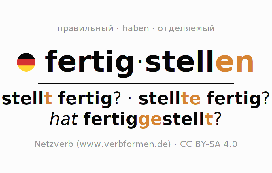 - Презенс: stell(e) (du) fertig, stellen wir fertig, stellt (ihr) fertig, stellen Sie fertig