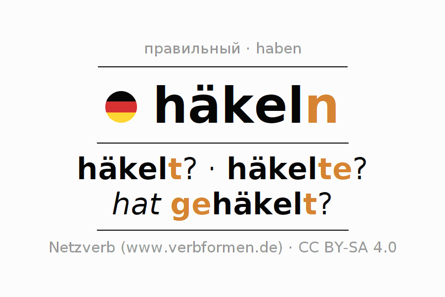 Спряжение глагола häkeln (вязать крючком, вязать) правильное. Формы глагола häkelt?, häkelte?, hat gehäkelt?. В качестве вспомогательного глагола к häkeln употребляется "haben". Склоняется в Действительный залог (актив) и употребляется в Вопросительное предложение. Для лучшего понимания приводится большое количество примеров употребления глагола häkeln. Для тренировки и закрепления навыков имеются также бесплатные рабочие листы по häkeln. Можно не только häkeln спрягать, но и все немецкие глаголы. Глагол включён в словарный запас обладателя сертификата знания немецкого языка уровня C1. Kомментарии ☆