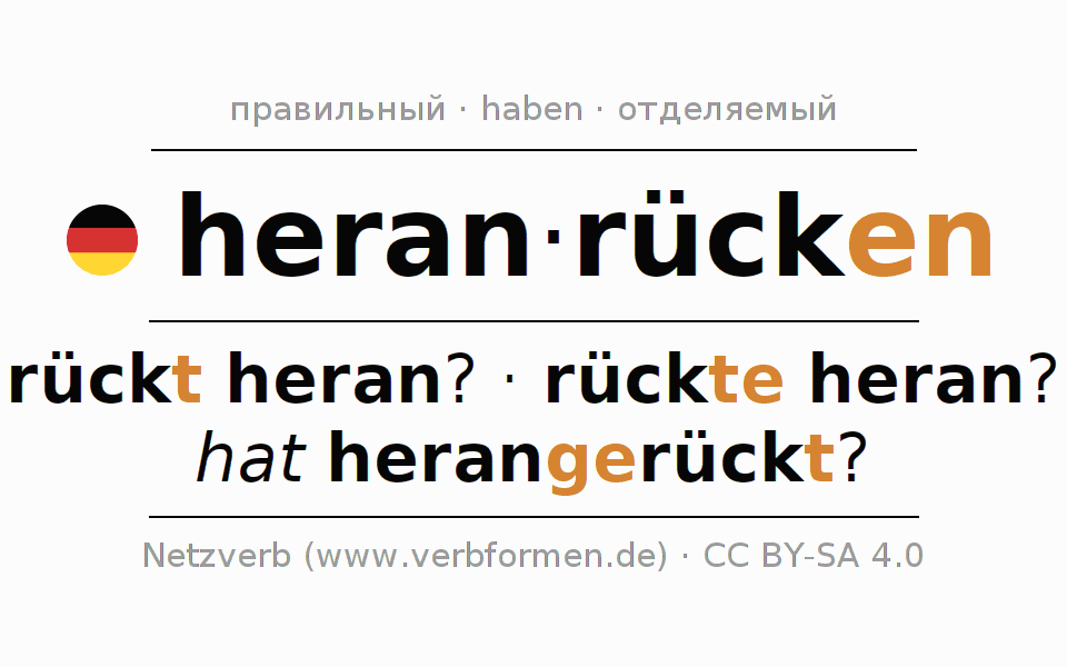 - Перфект: habe ich herangerückt?, hast du herangerückt?, hat er herangerückt?, haben wir herangerückt?, habt ihr herangerückt?, haben sie herangerückt?