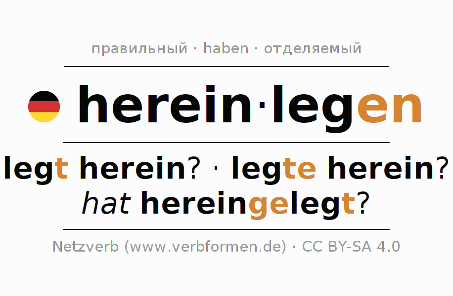 - Презенс: leg(e) (du) herein, legen wir herein, legt (ihr) herein, legen Sie herein