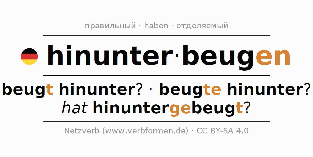 - Презенс: beug(e) (du) hinunter, beugen wir hinunter, beugt (ihr) hinunter, beugen Sie hinunter