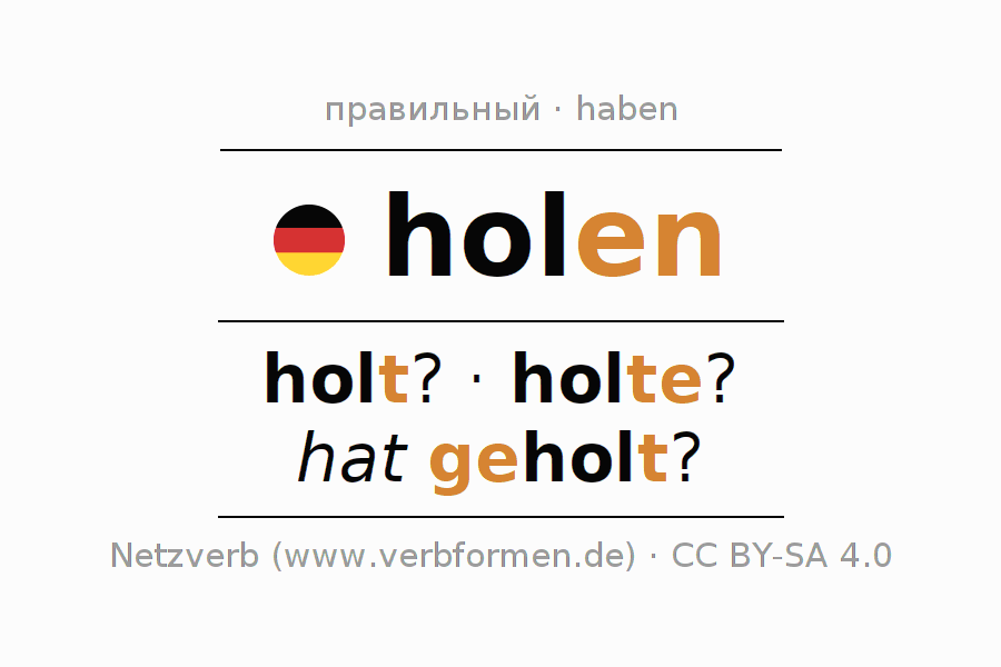 Глагол 'holen' онлайн как таблица глаголов со всеми наглядно представленными формами. Значение глагола holen таким образом является помощью для выполнения домашних заданий; подготовки к экзаменам и контрольным работам, а также к урокам немецкого языка; для обучения в вузах и при получении образования для взрослых. Именно для изучающих немецкий язык – правильное спряжение глаголов (holt? - holte? - hat geholt?) является решающим фактором.