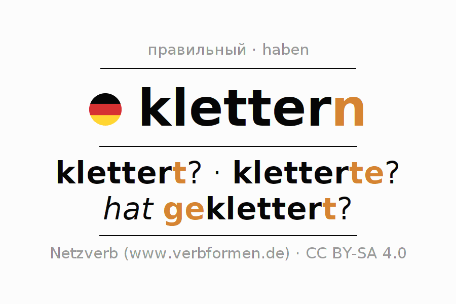 - Презенс: klett(e)r(e) ich?, kletterst du?, klettert er?, klettern wir?, klettert ihr?, klettern sie?