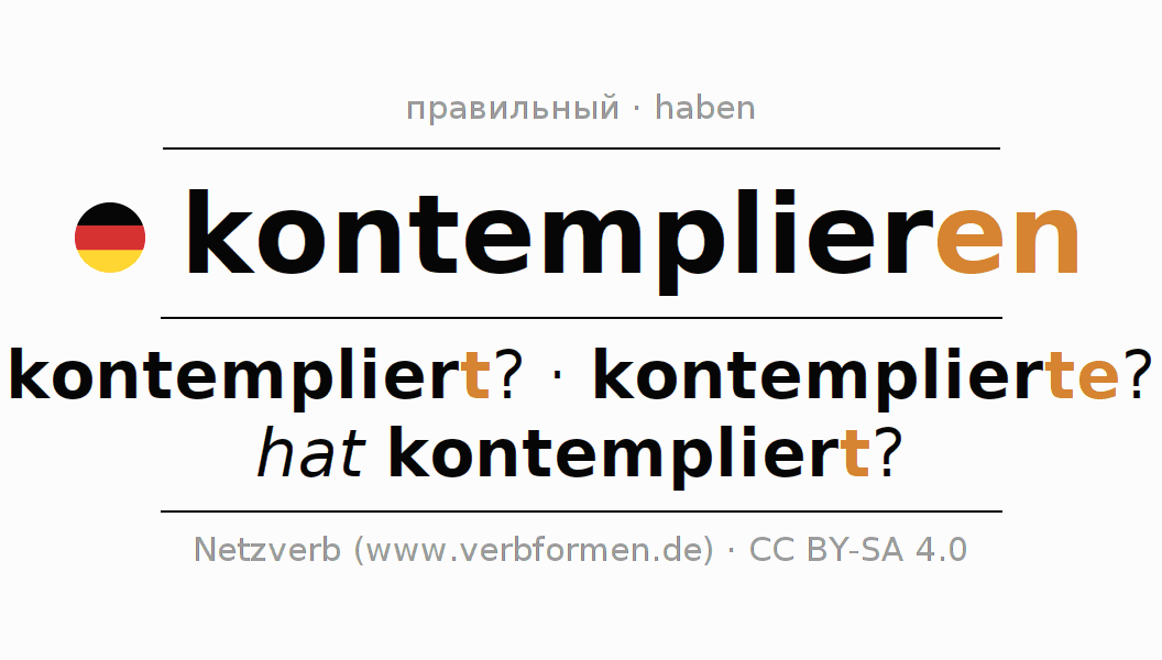- Перфект: habe ich kontempliert?, hast du kontempliert?, hat er kontempliert?, haben wir kontempliert?, habt ihr kontempliert?, haben sie kontempliert?