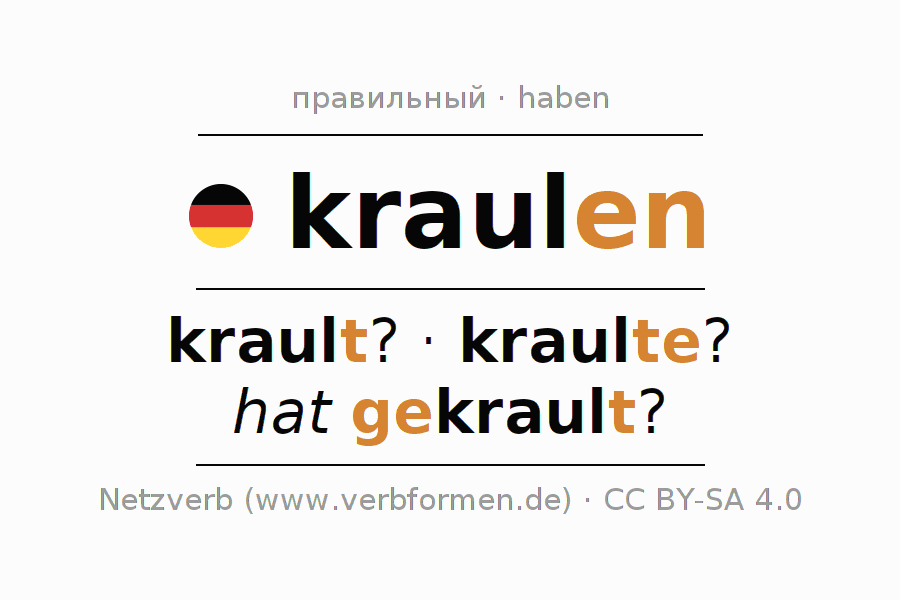 Глагол kraulen (hat) спрягается в индикативе Действительный залог (актив) в настоящем, прошедшем и будущем времени