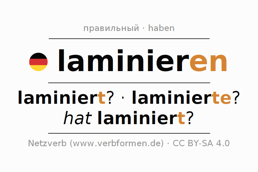 - Презенс: laminiere ich?, laminierest du?, laminiere er?, laminieren wir?, laminieret ihr?, laminieren sie?