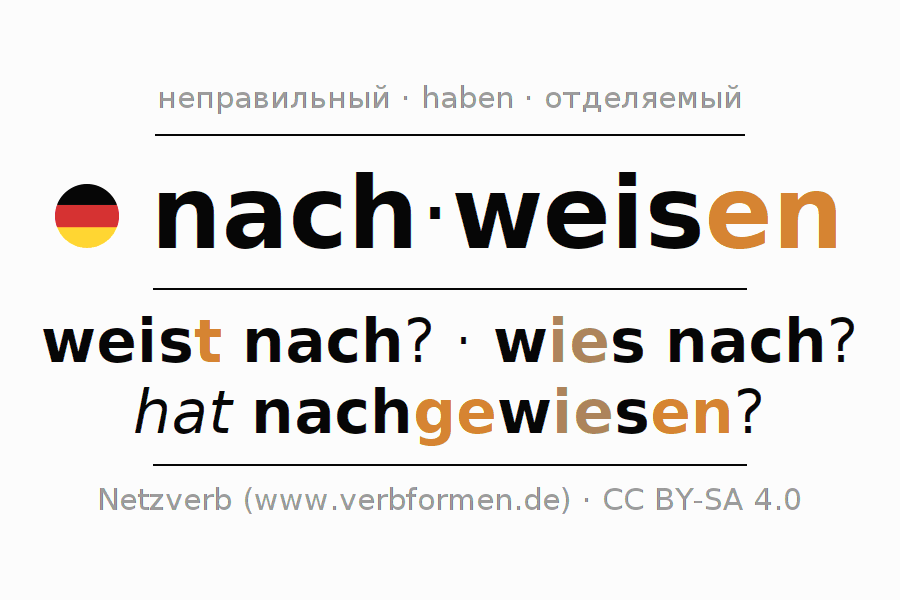 - Презенс: weis(e) (du) nach, weisen wir nach, weist (ihr) nach, weisen Sie nach