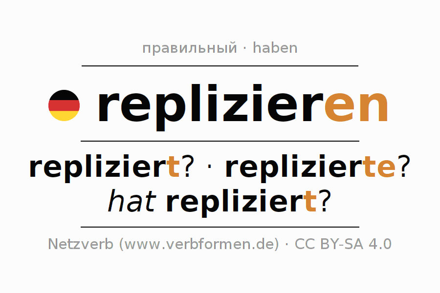 - Презенс: replizier(e) ich?, replizierst du?, repliziert er?, replizieren wir?, repliziert ihr?, replizieren sie?