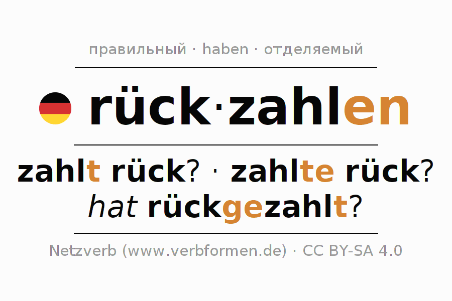 - Презенс: zahl(e) ich rück?, zahlst du rück?, zahlt er rück?, zahlen wir rück?, zahlt ihr rück?, zahlen sie rück?