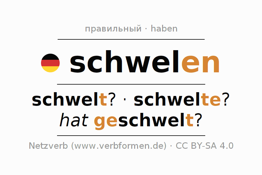 - Перфект: habe ich geschwelt?, habest du geschwelt?, habe er geschwelt?, haben wir geschwelt?, habet ihr geschwelt?, haben sie geschwelt?