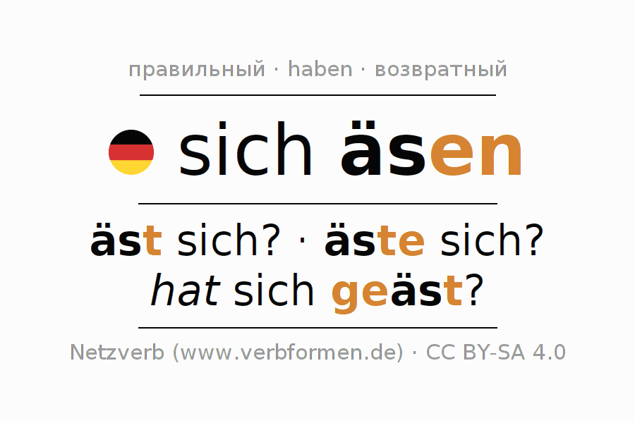 - Перфект: habe ich mich geäst?, hast du dich geäst?, hat es sich geäst?, haben wir uns geäst?, habt ihr euch geäst?, haben sie sich geäst?