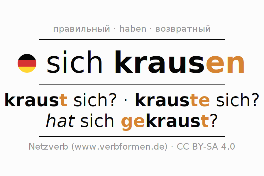 - Презенс: kraus(e) (du) dir/dich, krausen wir uns, kraust (ihr) euch, krausen Sie sich