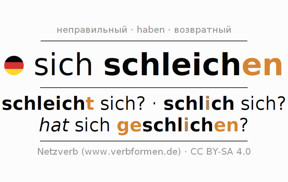 Спряжение глагола schleichen (красться, забираться) неправильное. Формы глагола schleicht sich?, schlich sich?, hat sich geschlichen?. Чередующиеся гласные ei - i - i в корне: В качестве вспомогательного глагола к sich schleichen употребляется "haben". Однако имеются временные формы со вспомогательным глаголом sein. Глагол sich schleichen употреблён в возвратной форме. Может употреблятьсяи невозвратная форма глагола. Склоняется в Действительный залог (актив) и употребляется в Вопросительное предложение. Для лучшего понимания приводится большое количество примеров употребления глагола schleichen. Для тренировки и закрепления навыков имеются также бесплатные рабочие листы по schleichen. Можно не только sich schleichen спрягать, но и все немецкие глаголы. Глагол включён в словарный запас обладателя сертификата знания немецкого языка уровня B2. Kомментарии ☆