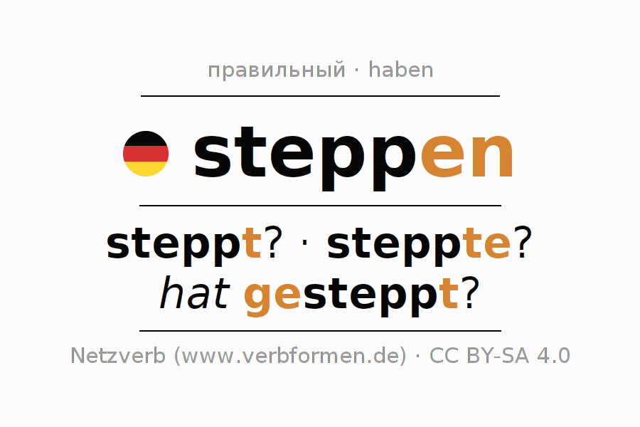 - Презенс: stepp(e) ich?, steppst du?, steppt er?, steppen wir?, steppt ihr?, steppen sie?