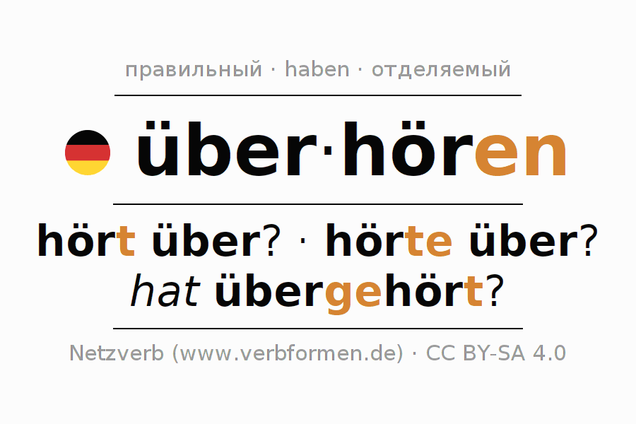 - Презенс: hör(e) (du) über, hören wir über, hört (ihr) über, hören Sie über