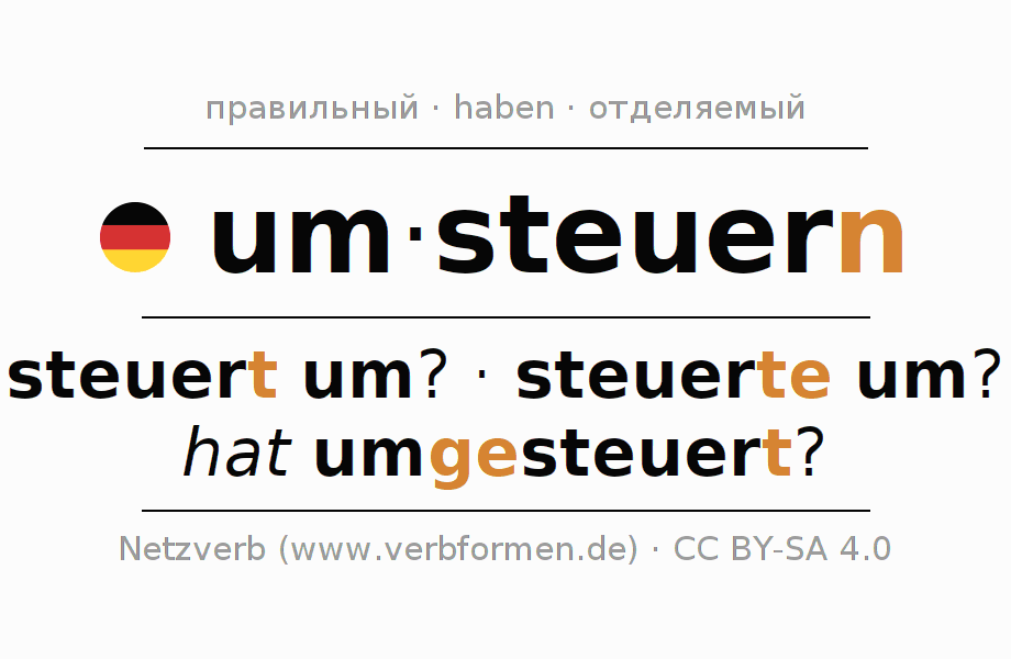 - Презенс: steu(e)r(e) ich um?, steuerst du um?, steuert er um?, steuern wir um?, steuert ihr um?, steuern sie um?