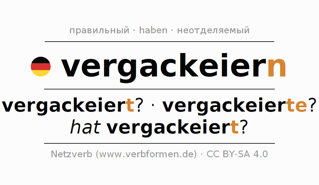 Глагол 'vergackeiern' онлайн как таблица глаголов со всеми наглядно представленными формами. Значение глагола vergackeiern таким образом является помощью для выполнения домашних заданий; подготовки к экзаменам и контрольным работам, а также к урокам немецкого языка; для обучения в вузах и при получении образования для взрослых. Именно для изучающих немецкий язык – правильное спряжение глаголов (vergackeiert? - vergackeierte? - hat vergackeiert?) является решающим фактором.