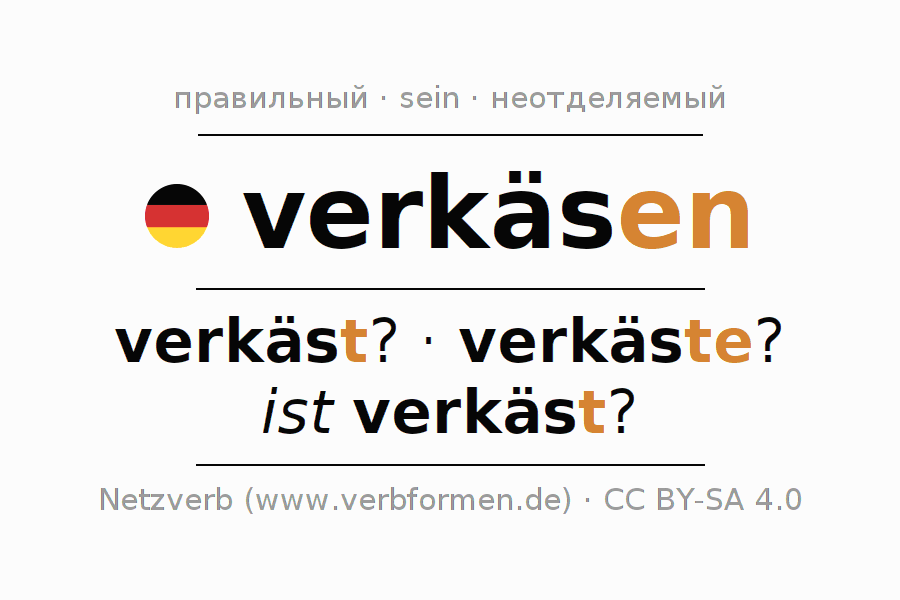 - Презенс: verkäs(e) (du), verkäsen wir, verkäst (ihr), verkäsen Sie
