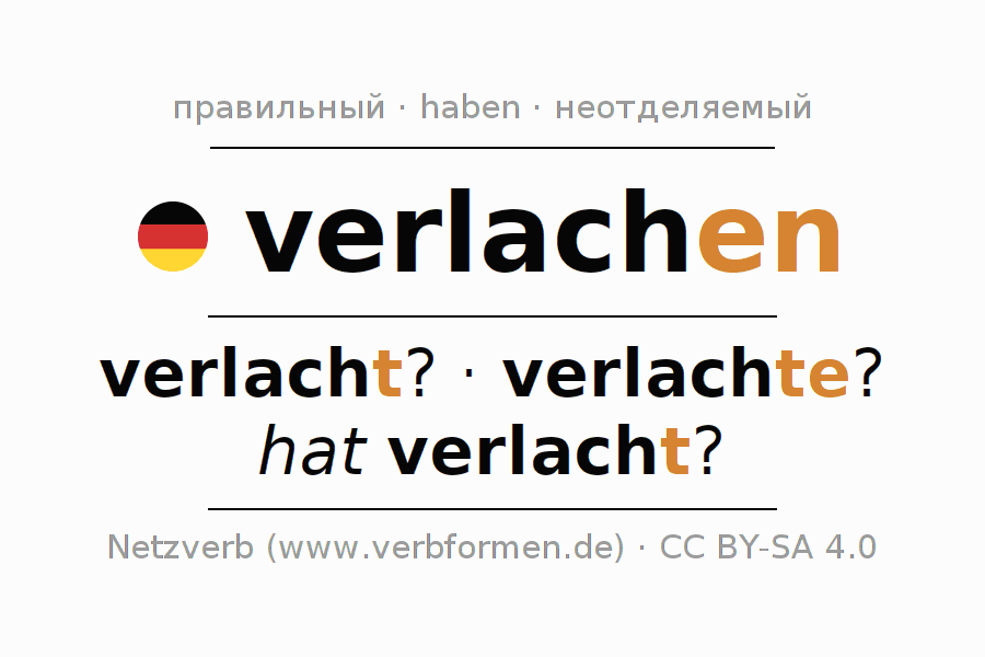 Спряжение глагола verlachen (насмехаться, подсмеиваться) правильное. Формы глагола verlacht?, verlachte?, hat verlacht?. В качестве вспомогательного глагола к verlachen употребляется "haben". Приставка ver- для verlachen неотделяемая. Склоняется в Действительный залог (актив) и употребляется в Вопросительное предложение. Для лучшего понимания приводится большое количество примеров употребления глагола verlachen. Для тренировки и закрепления навыков имеются также бесплатные рабочие листы по verlachen. Можно не только verlachen спрягать, но и все немецкие глаголы. Глагол включён в словарный запас обладателя сертификата знания немецкого языка уровня C2. Kомментарии ☆