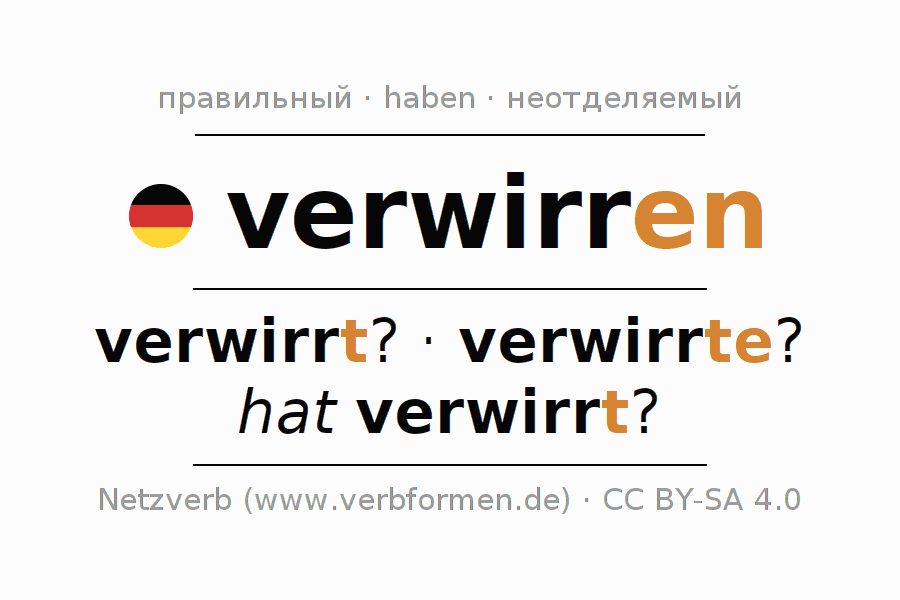 - Презенс: verwirr(e) ich?, verwirrst du?, verwirrt er?, verwirren wir?, verwirrt ihr?, verwirren sie?