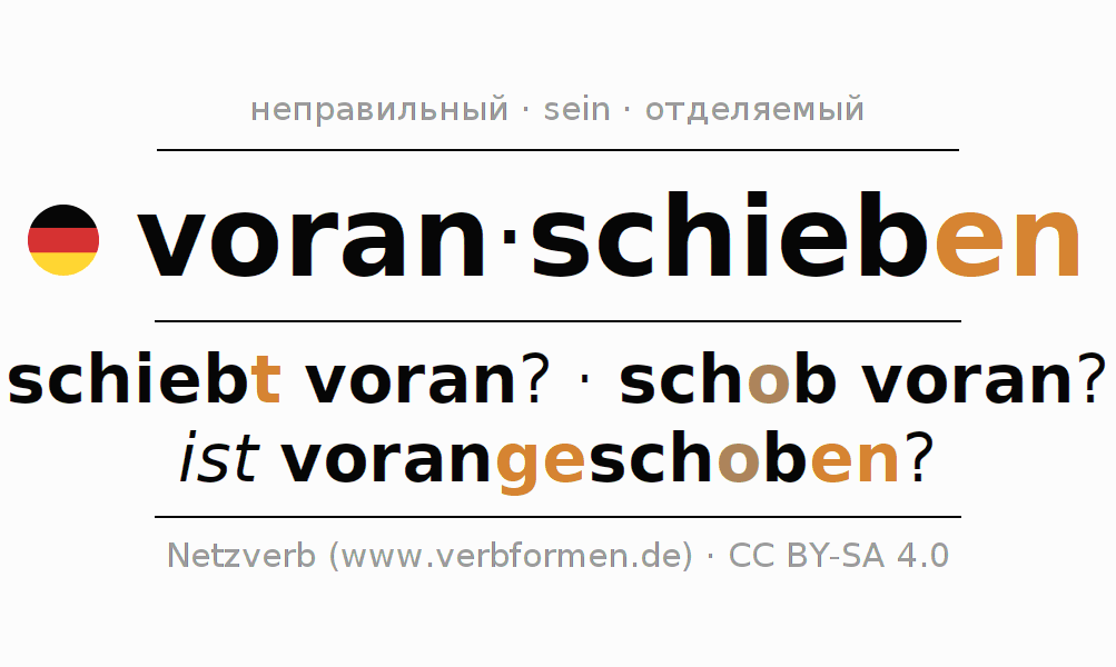 - Презенс: schieb(e) ich voran?, schiebst du voran?, schiebt er voran?, schieben wir voran?, schiebt ihr voran?, schieben sie voran?