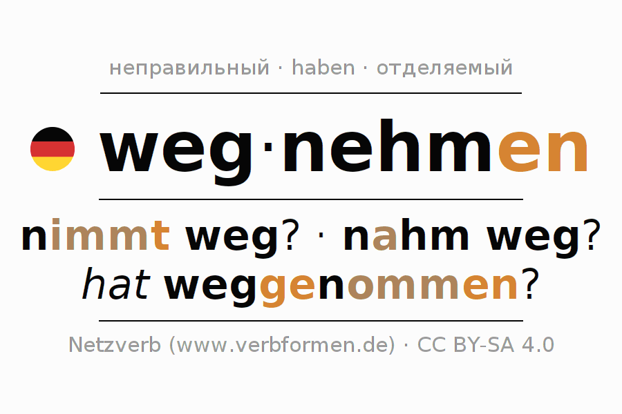 Спряжение глагола wegnehmen (отнимать, забирать) неправильное. Формы глагола nimmt weg?, nahm weg?, hat weggenommen?. Чередующиеся гласные e - a - o в корне: В качестве вспомогательного глагола к wegnehmen употребляется "haben". Приставка weg- для wegnehmen отделяемая. Склоняется в Действительный залог (актив) и употребляется в Вопросительное предложение. Для лучшего понимания приводится большое количество примеров употребления глагола wegnehmen. Для тренировки и закрепления навыков имеются также бесплатные рабочие листы по wegnehmen. Можно не только wegnehmen спрягать, но и все немецкие глаголы. Глагол включён в словарный запас обладателя сертификата знания немецкого языка уровня A2. Kомментарии ☆