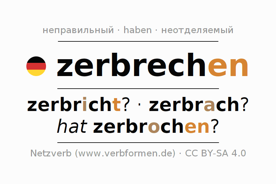 Все временные формы глагола и отглагольных форм zerbrechen (hat)
