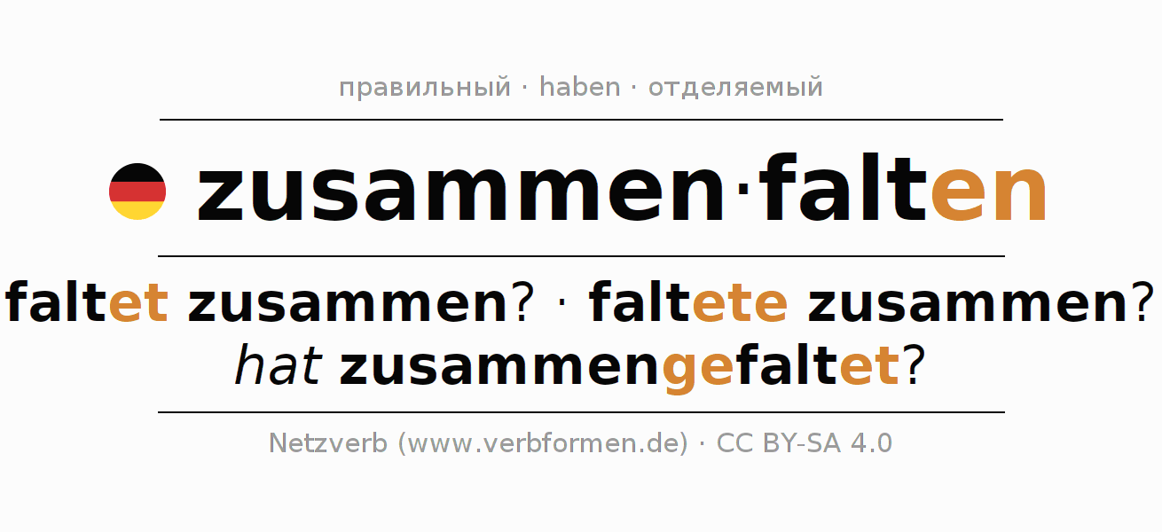 - Презенс: falt(e) (du) zusammen, falten wir zusammen, faltet (ihr) zusammen, falten Sie zusammen