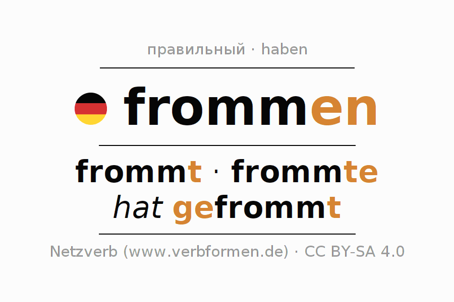 - Презенс: fromm(e) (du), frommen wir, frommt (ihr), frommen Sie