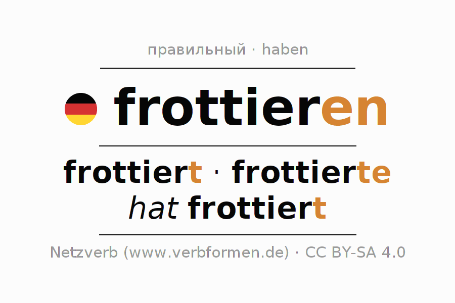 - Презенс: frottier(e) (du), frottieren wir, frottiert (ihr), frottieren Sie