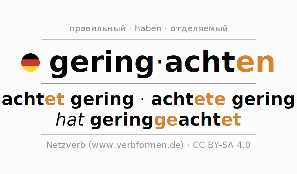 - Презенс: acht(e) (du) gering, achten wir gering, achtet (ihr) gering, achten Sie gering