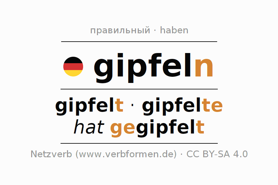 - Перфект: ich habe gegipfelt, du hast gegipfelt, er hat gegipfelt, wir haben gegipfelt, ihr habt gegipfelt, sie haben gegipfelt