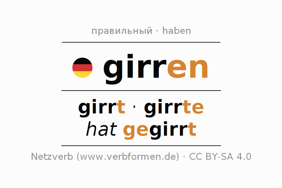 - Презенс: girr(e) (du), girren wir, girrt (ihr), girren Sie