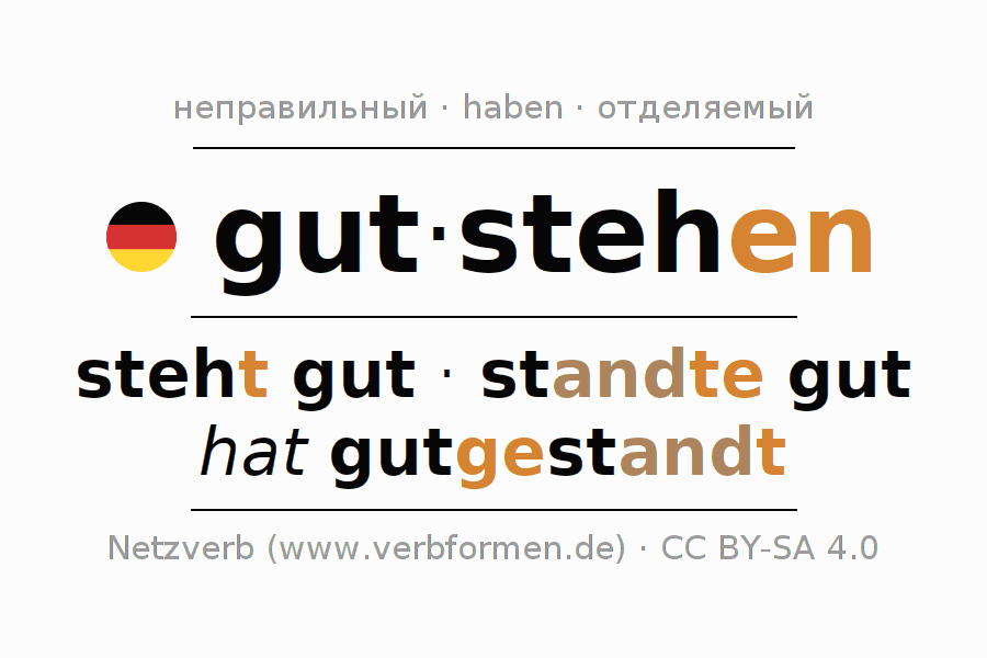 - Презенс: ich steh(e) gut, du stehst gut, er steht gut, wir steh(e)n gut, ihr steht gut, sie steh(e)n gut