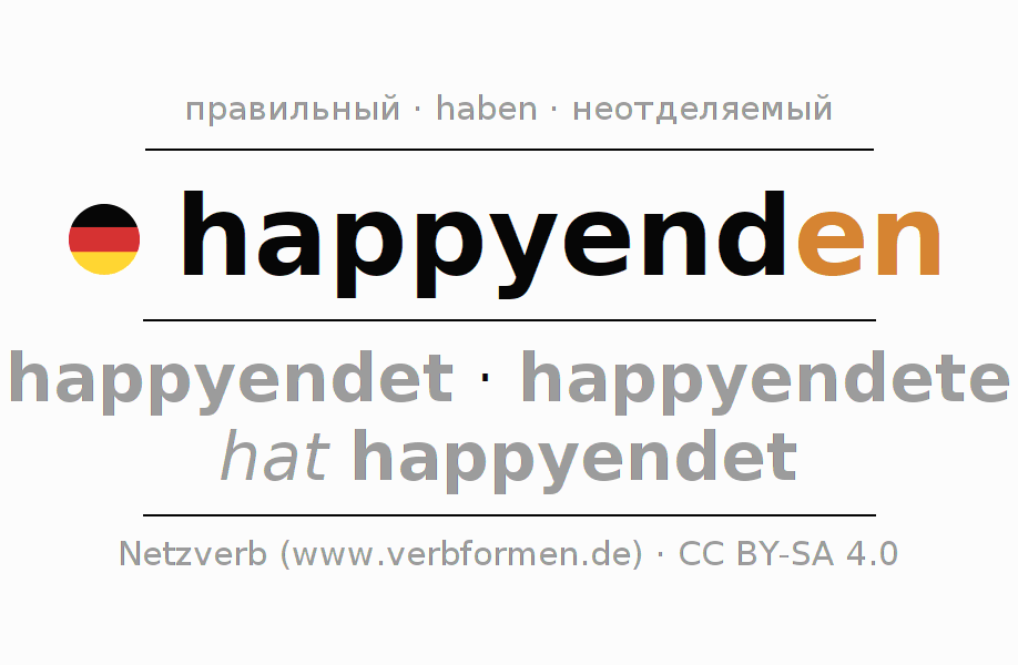 - Перфект: ich habe happyendet, du hast happyendet, er hat happyendet, wir haben happyendet, ihr habt happyendet, sie haben happyendet