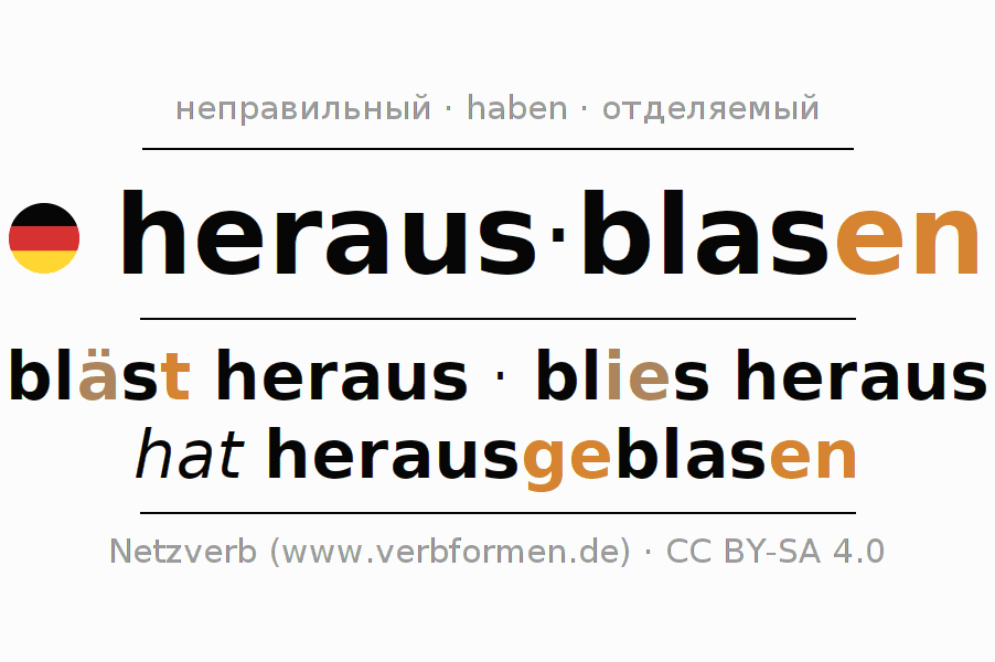 - Презенс: blas(e) (du) heraus, blasen wir heraus, blast (ihr) heraus, blasen Sie heraus