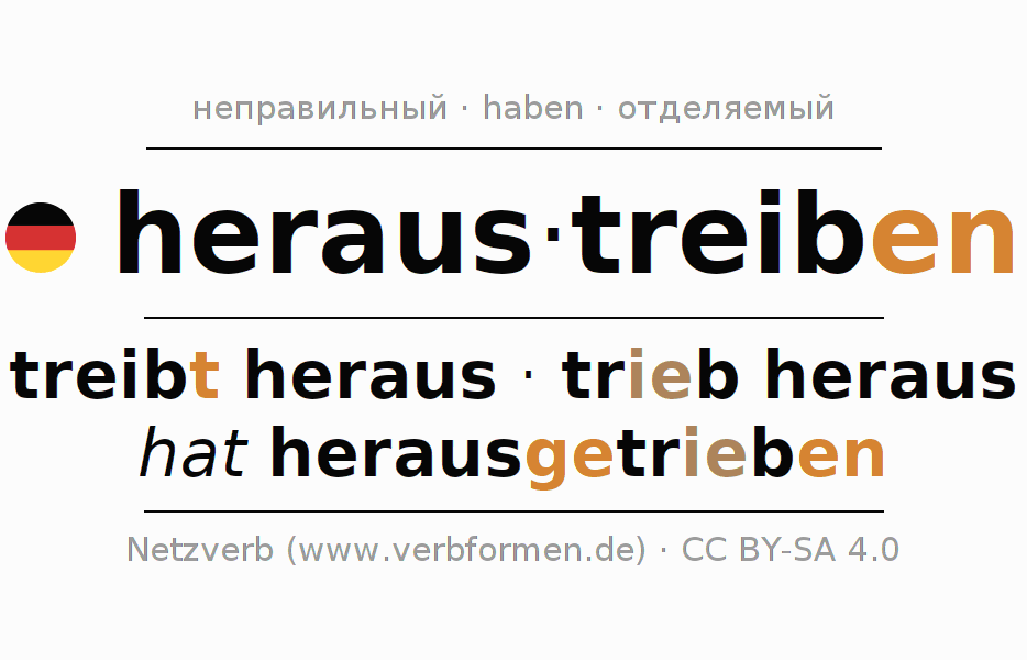 - Презенс: treib(e) (du) heraus, treiben wir heraus, treibt (ihr) heraus, treiben Sie heraus