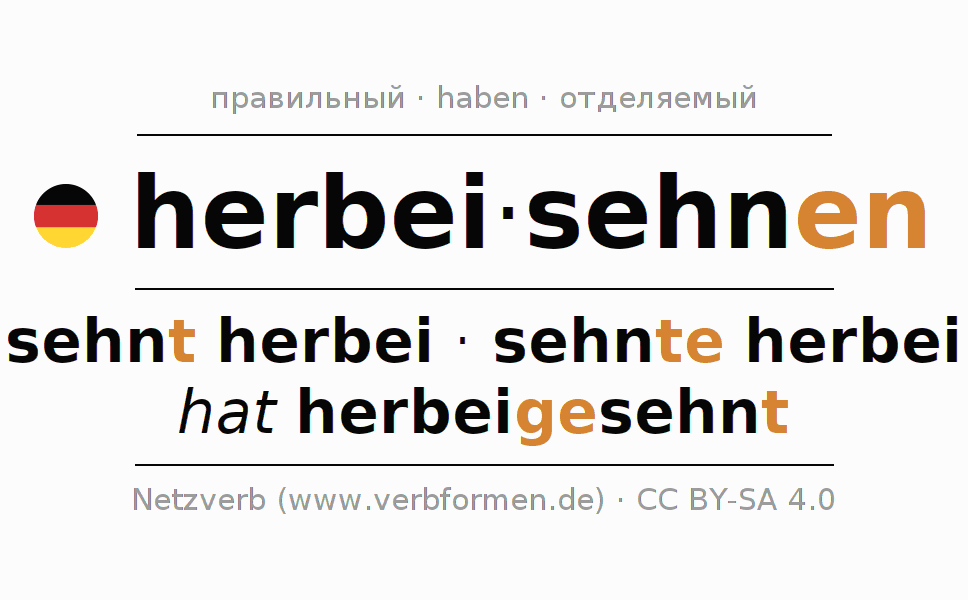 - Презенс: sehn(e) (du) herbei, sehnen wir herbei, sehnt (ihr) herbei, sehnen Sie herbei