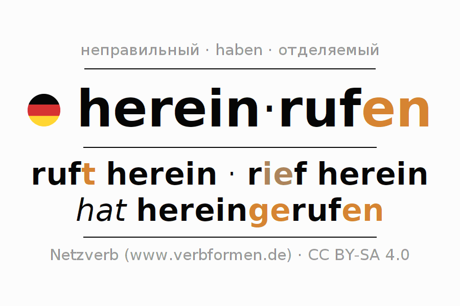 - Презенс: ruf(e) (du) herein, rufen wir herein, ruft (ihr) herein, rufen Sie herein