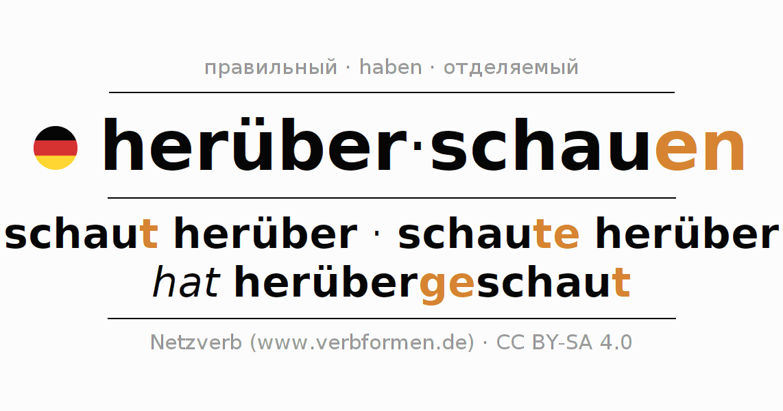 - Перфект: ich habe herübergeschaut, du habest herübergeschaut, er habe herübergeschaut, wir haben herübergeschaut, ihr habet herübergeschaut, sie haben herübergeschaut