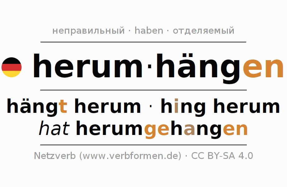 - Презенс: ich häng(e) herum, du hängst herum, er hängt herum, wir hängen herum, ihr hängt herum, sie hängen herum