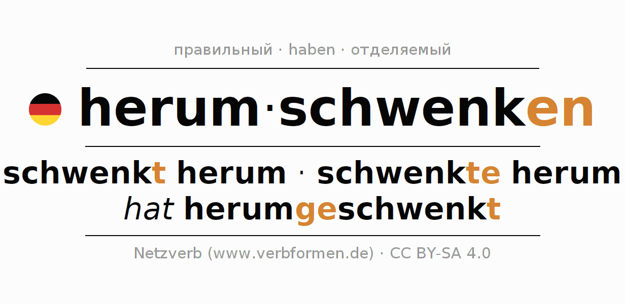 - Презенс: schwenk(e) (du) herum, schwenken wir herum, schwenkt (ihr) herum, schwenken Sie herum