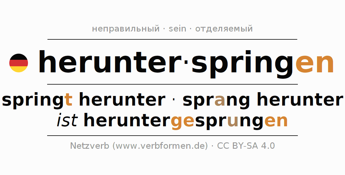 Простые формы спряжения глаголов в презенсе, претеритуме, императиве и конъюнктиве herunterspringen