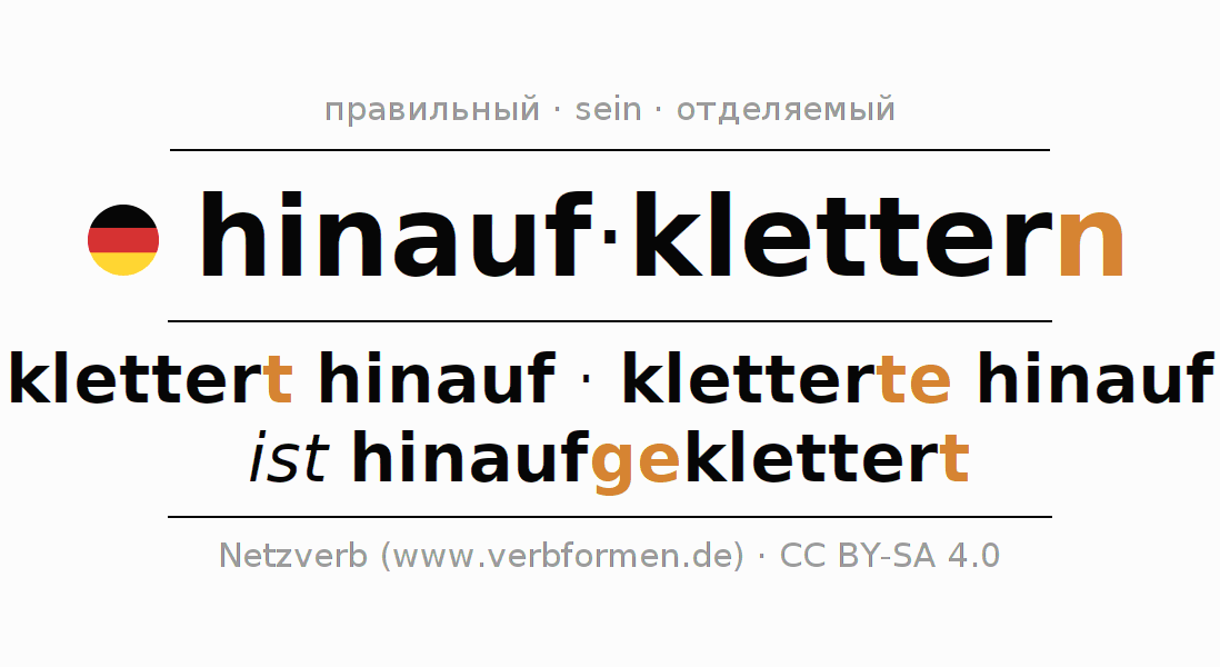 - Презенс: klett(e)r(e) (du) hinauf, klettern wir hinauf, klettert (ihr) hinauf, klettern Sie hinauf