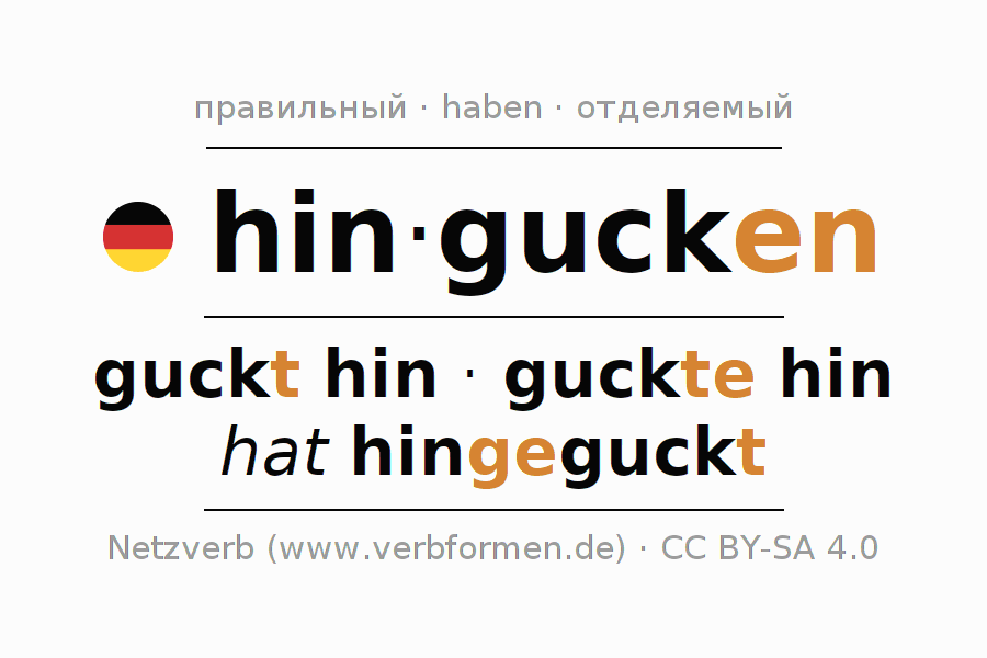 Спряжение глагола hingucken (смотреть, внимательно смотреть) правильное. Формы глагола guckt hin, guckte hin, hat hingeguckt. В качестве вспомогательного глагола к hingucken употребляется "haben". Приставка hin- для hingucken отделяемая. Склоняется в Действительный залог (актив) и употребляется в Главное предложение. Для лучшего понимания приводится большое количество примеров употребления глагола hingucken. Для тренировки и закрепления навыков имеются также бесплатные рабочие листы по hingucken. Можно не только hingucken спрягать, но и все немецкие глаголы. Глагол включён в словарный запас обладателя сертификата знания немецкого языка уровня C1. Kомментарии ☆