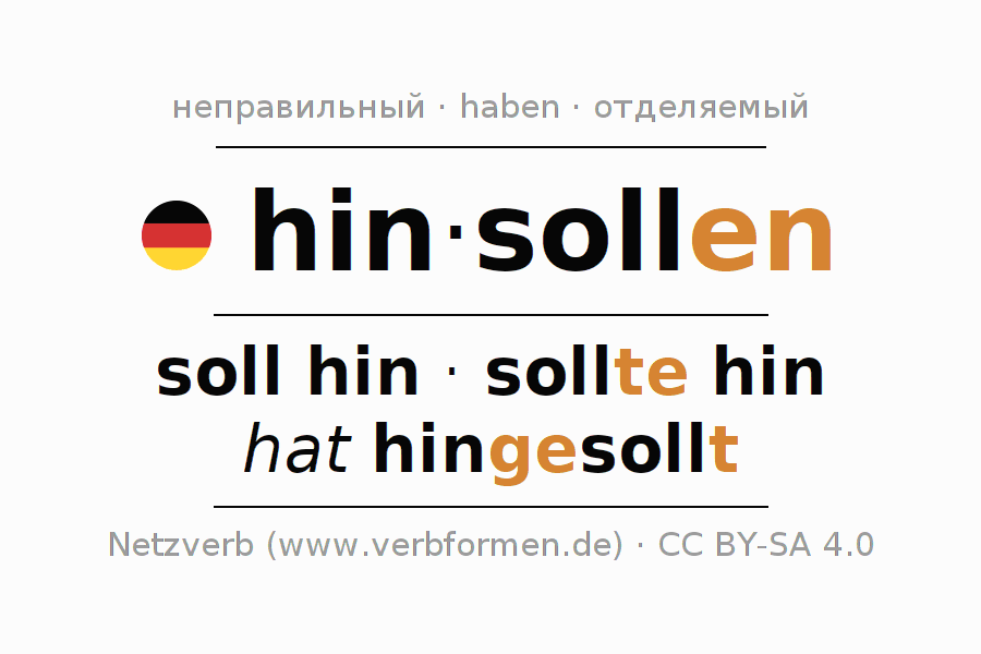 - Презенс: ich soll hin, du sollst hin, er soll hin, wir sollen hin, ihr sollt hin, sie sollen hin
