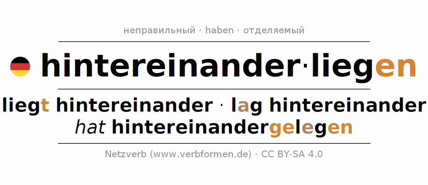 - Презенс: lieg(e) (du) hintereinander, liegen wir hintereinander, liegt (ihr) hintereinander, liegen Sie hintereinander